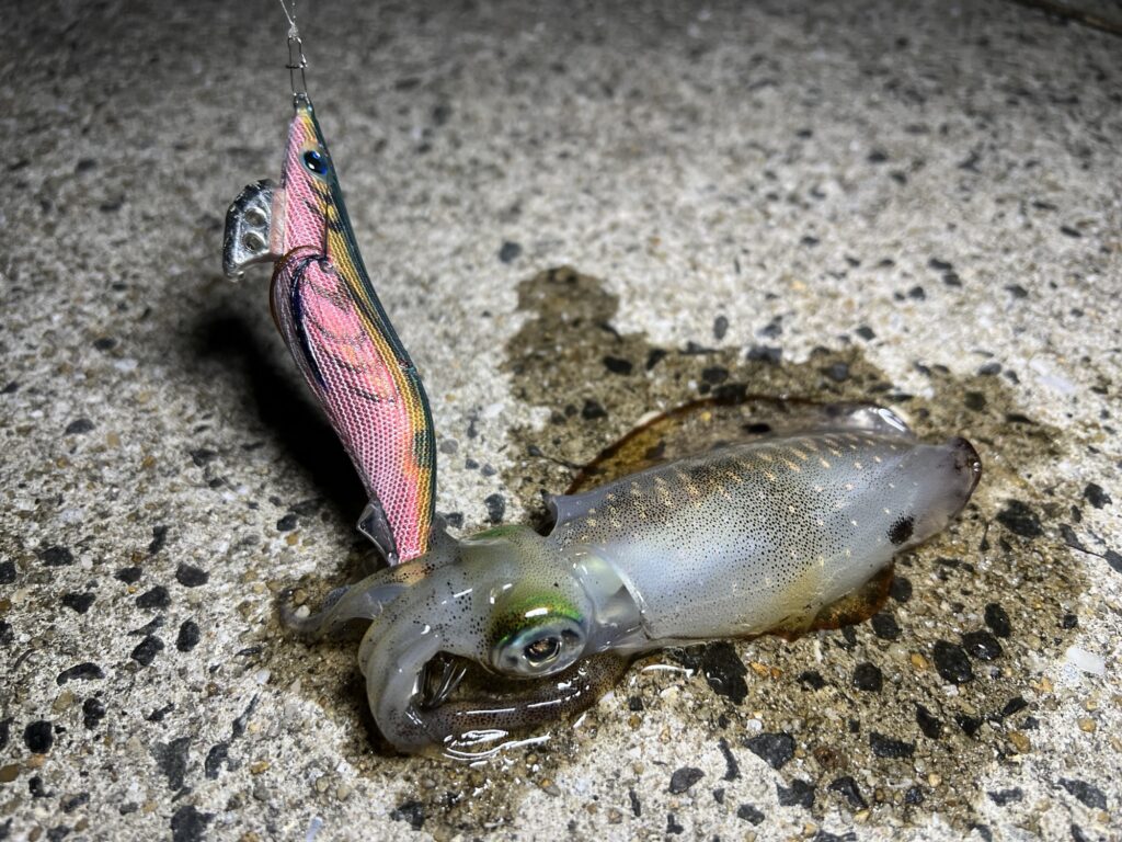 するとすぐに結果が出る。キャストしてエギ着水後、2~3秒して軽くシャクってみると、、、