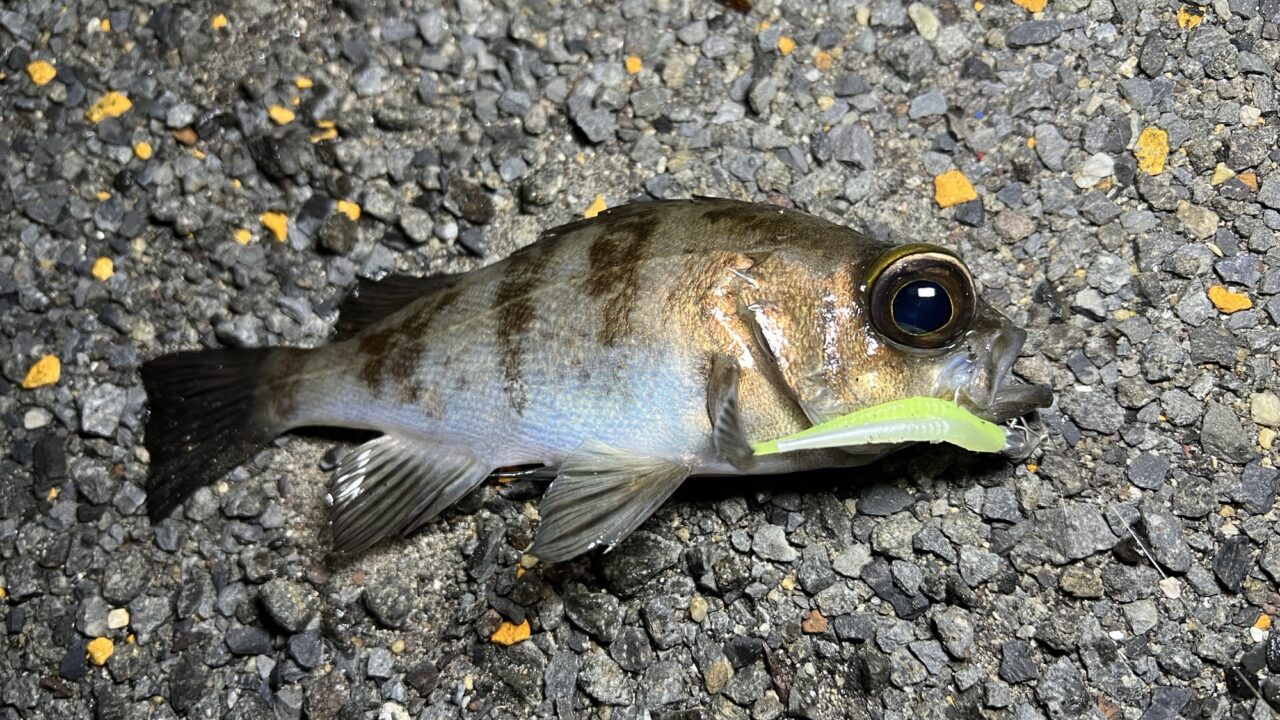 そこで、メバルがいることは確定した常夜灯の周辺ではなく、試しに角の逆向きの暗がり沖目にキャスト。漁港自体にメバルがいることは分かったので、このリグに反応する個体探しに精を出す。少しだけロッドをシェイクして微振動チックなアクションを加えてみると、、、