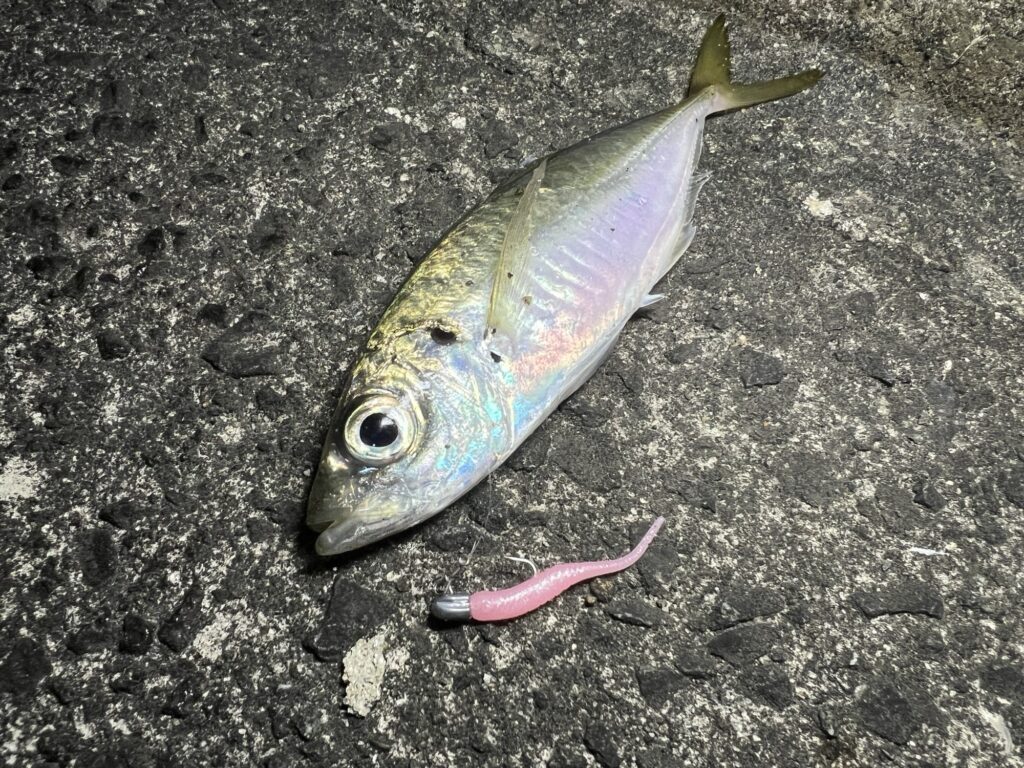 メバルで実績を(無理やり)上げたギョピンの別カラー、ナノラメグローピンクを選択。理由は特にないんだけど、アジにはピンクがいい気がしたから~w(゚∀゚)←もう釣ってる時も今書いてる時も超適当に成り下がる(;’∀’)