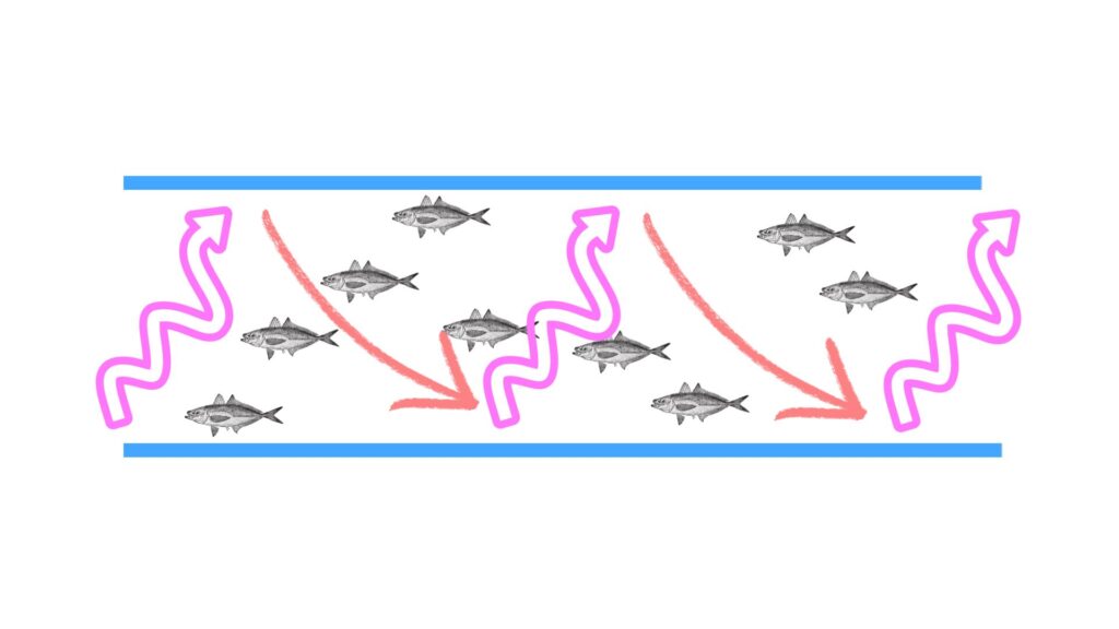 リフトについても、ロッドを傾ける角度(どこまで竿先を上げるか)、ラインを巻き取る量で調節可能。リフトとフォールの幅を状況に応じて変えられるようになると、リグを無駄なくアジの遊泳層に通すことができる\( ̄^ ̄)/