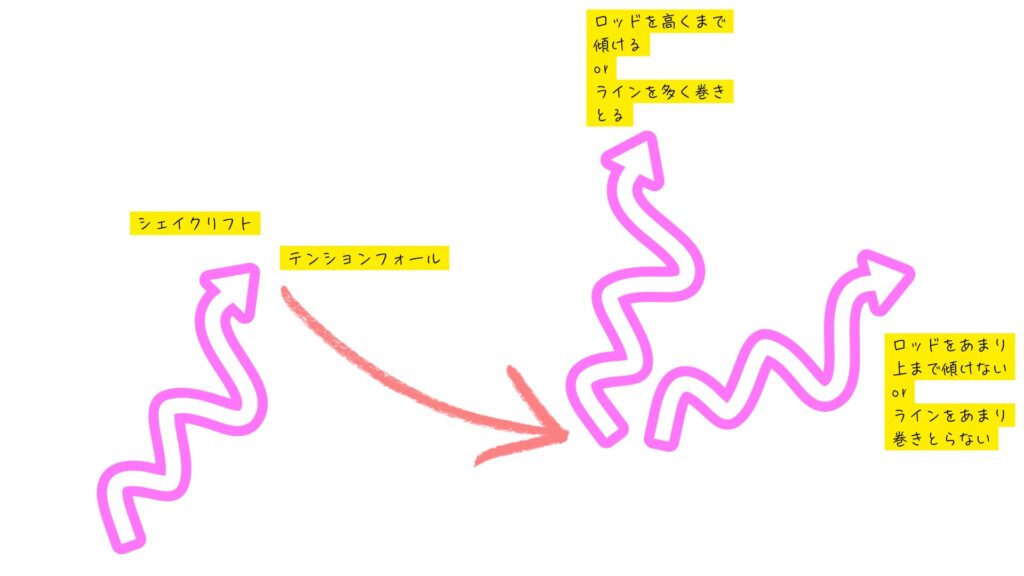 リグのフォールスピード(沈降速度)は、ロッドワークで調整できる。テンションフォールの際にゆっくりとロッドを立てていくと、ロッドを動かさない場合と比べフォールの幅が狭く(あまり沈まない)なるp(`・ω・´)q