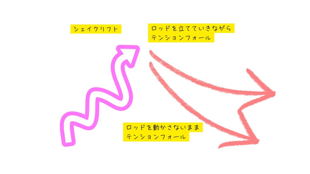 イメージ的には、シェイクはリグの海中での状況を把握するための動作で、フォールのタイミングで食わせの間を作ってあげるって感じかな。シェイクしながらリフトさせるのは、リグにアクションを加える意味合いもあるけど、細かく動かすことでリグの状態をしっかりイメージしながら操作することに重きを置いている( ̄▽ ̄)ノ_彡☆バンバン!